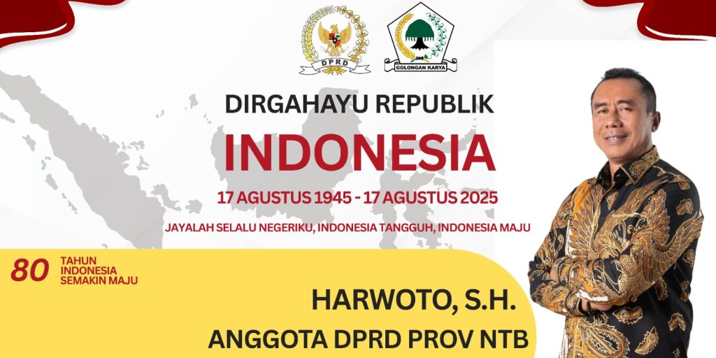 Mataram,(Tumbuhmedia.com) – Dalam semangat merah putih yang terus berkibar di langit nusantara, Anggota DPRD Provinsi NTB Harwoto,S.H. menyampaikan ucapan selamat memperingati Hari Ulang Tahun Kemerdekaan Republik Indonesia ke-80 Tahun.
